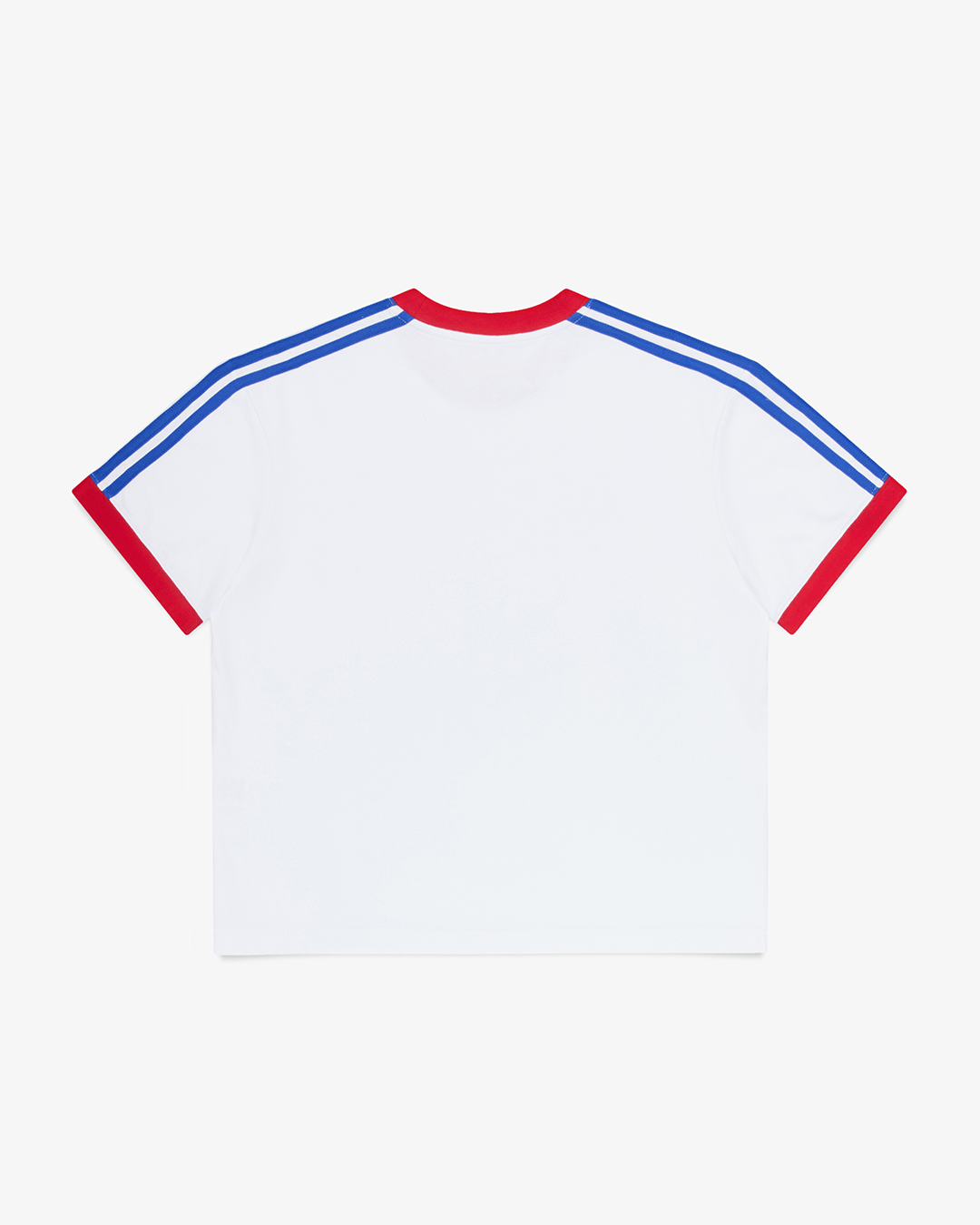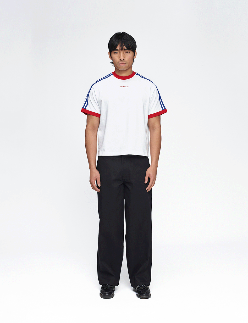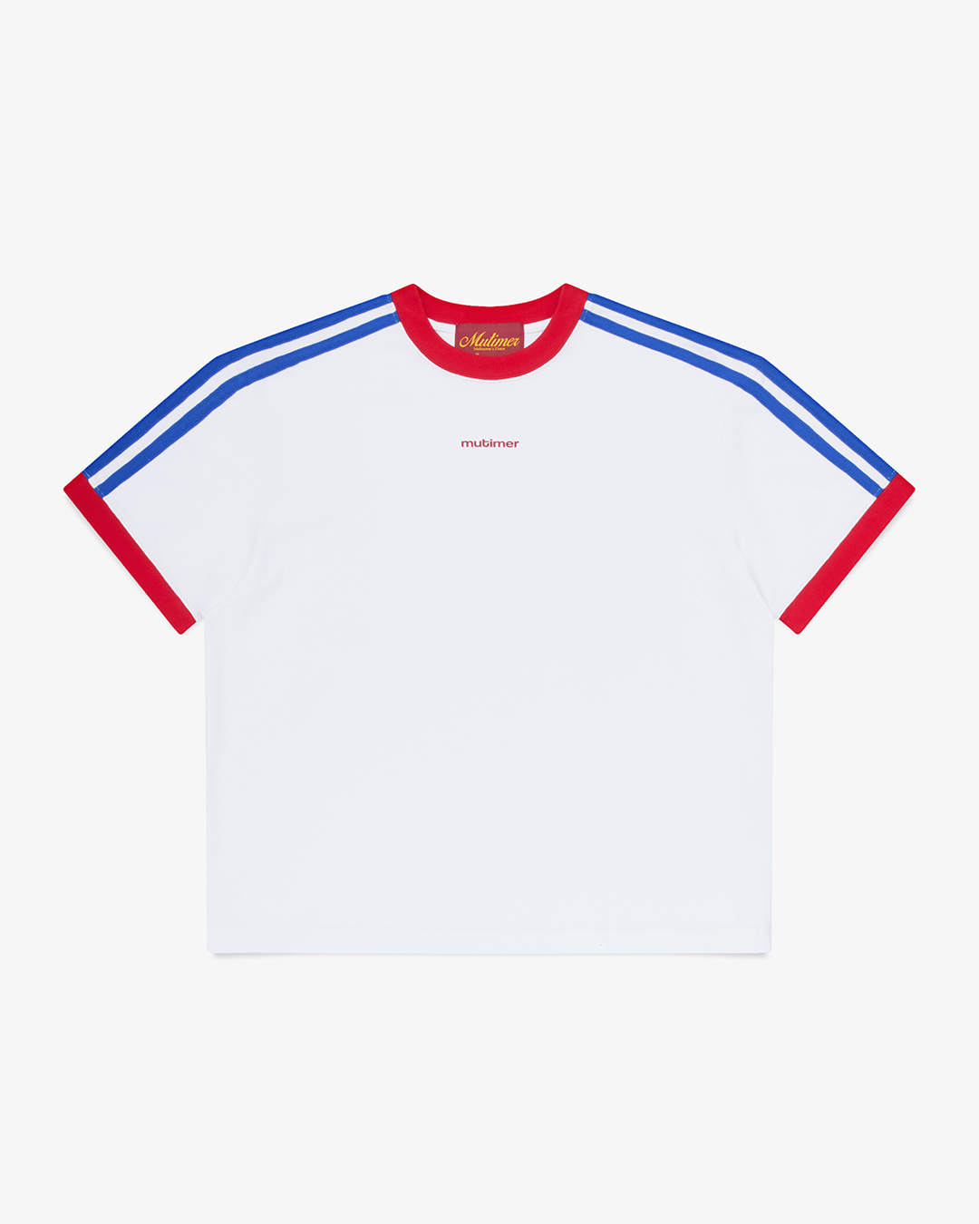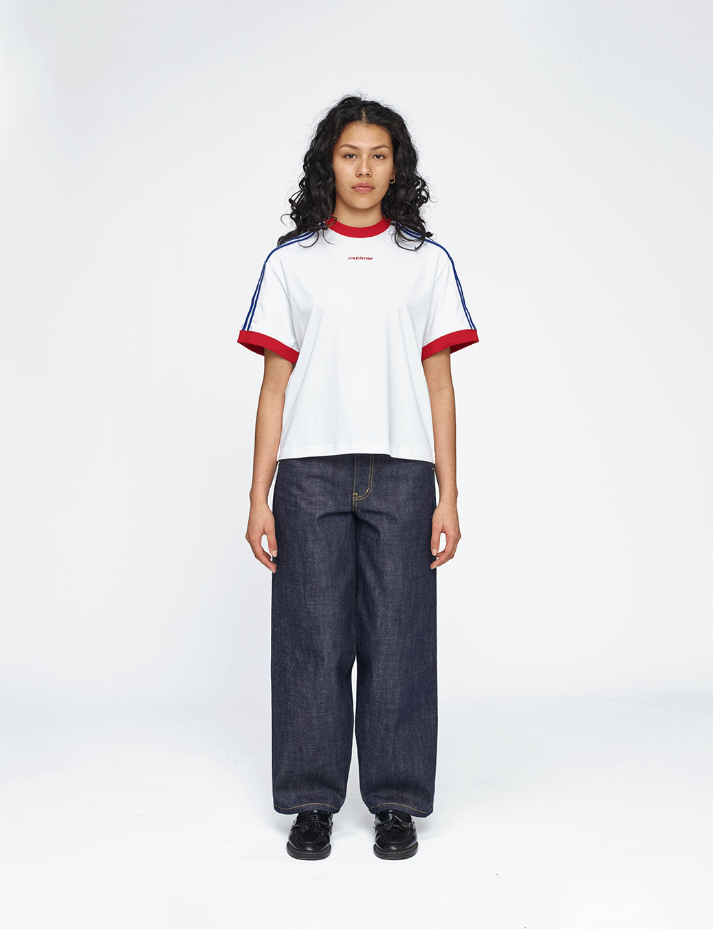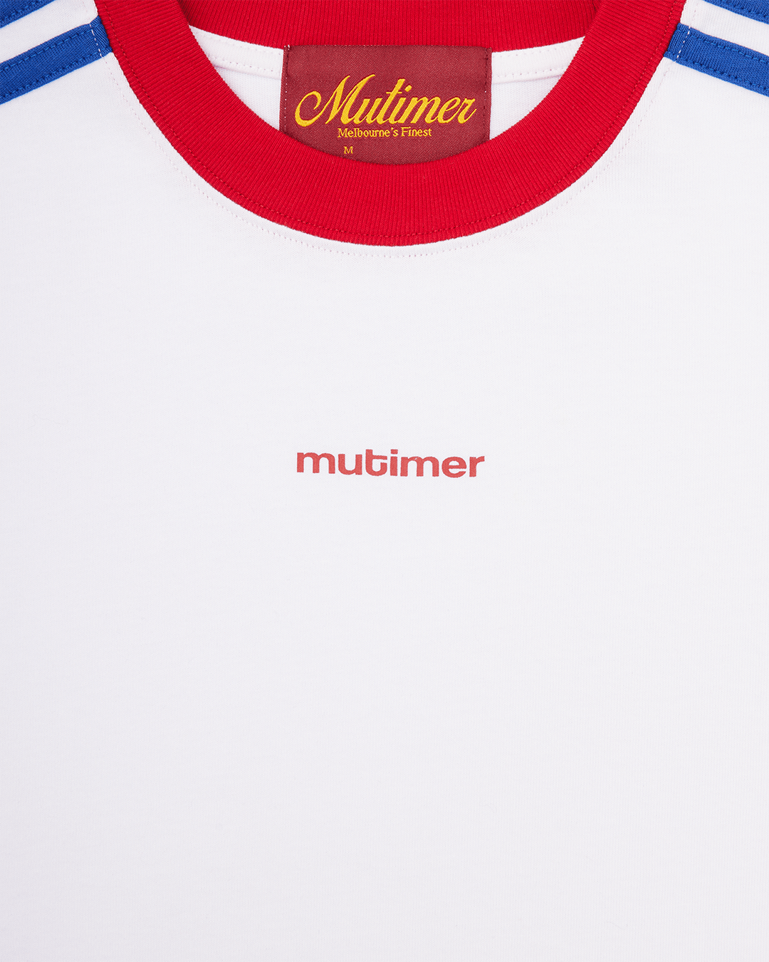 Designed using our Everyday t-shirt fit, the White Lundun Ringer is crafted from soft midweight cotton and features four-stripe detailing on sleeves, Mutimer printed graphic with contrast ribbing at the neckline, sleeves and hem.