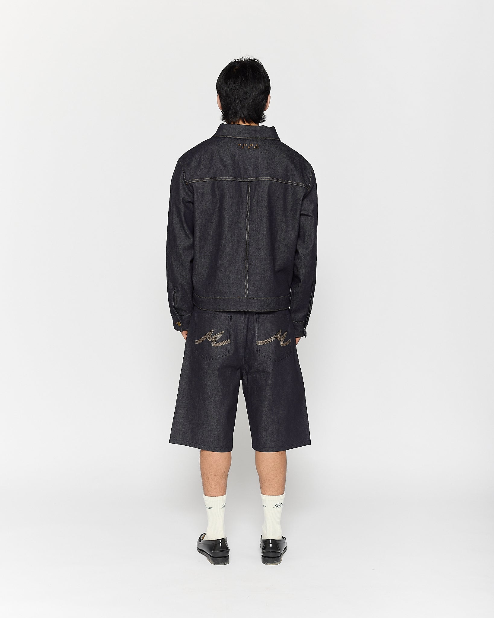 This garment is made from raw, unsanforized denim. Dye may transfer to lighter surfaces, and slight shrinkage can occur after washing. Follow care instructions to preserve colour and fit.