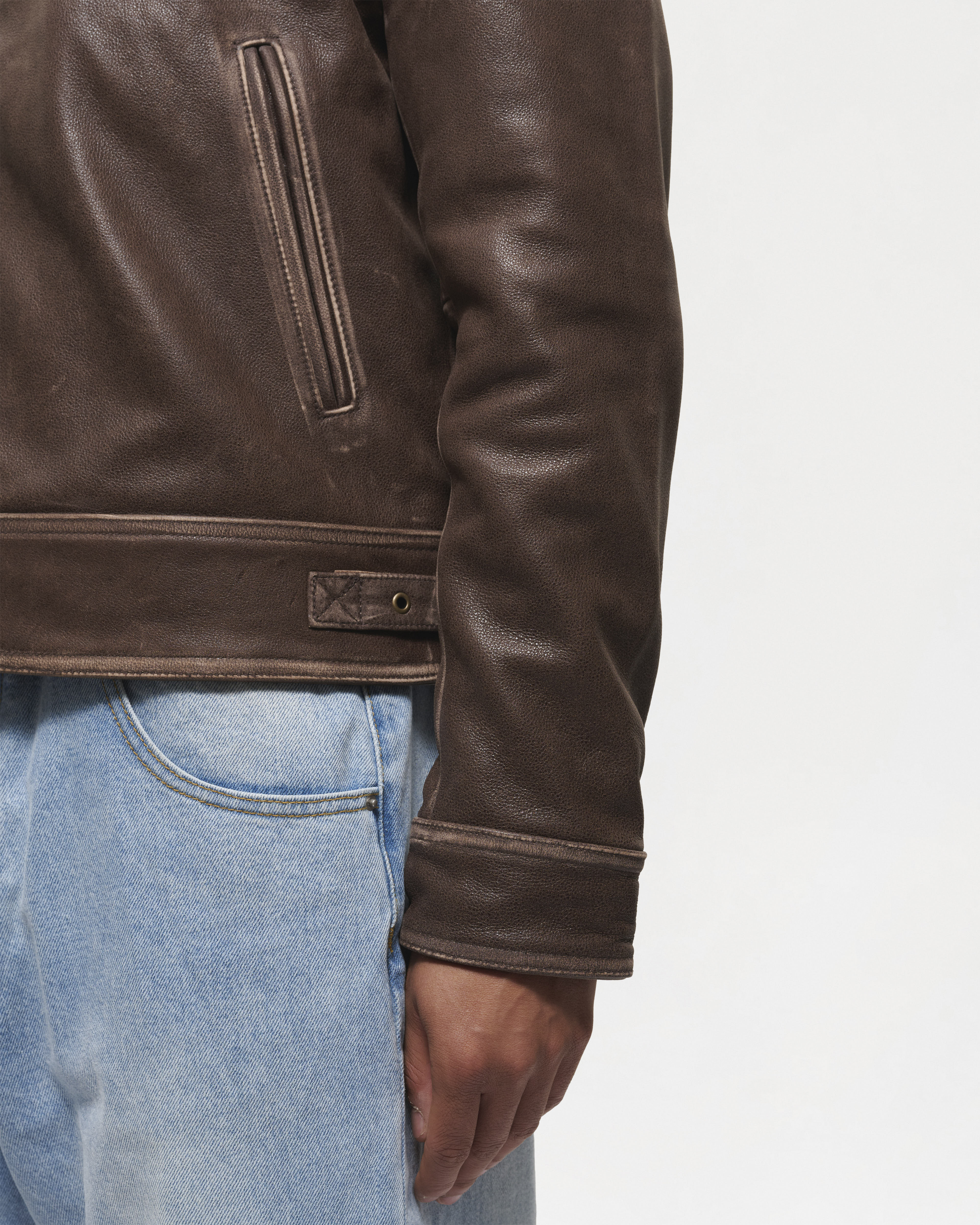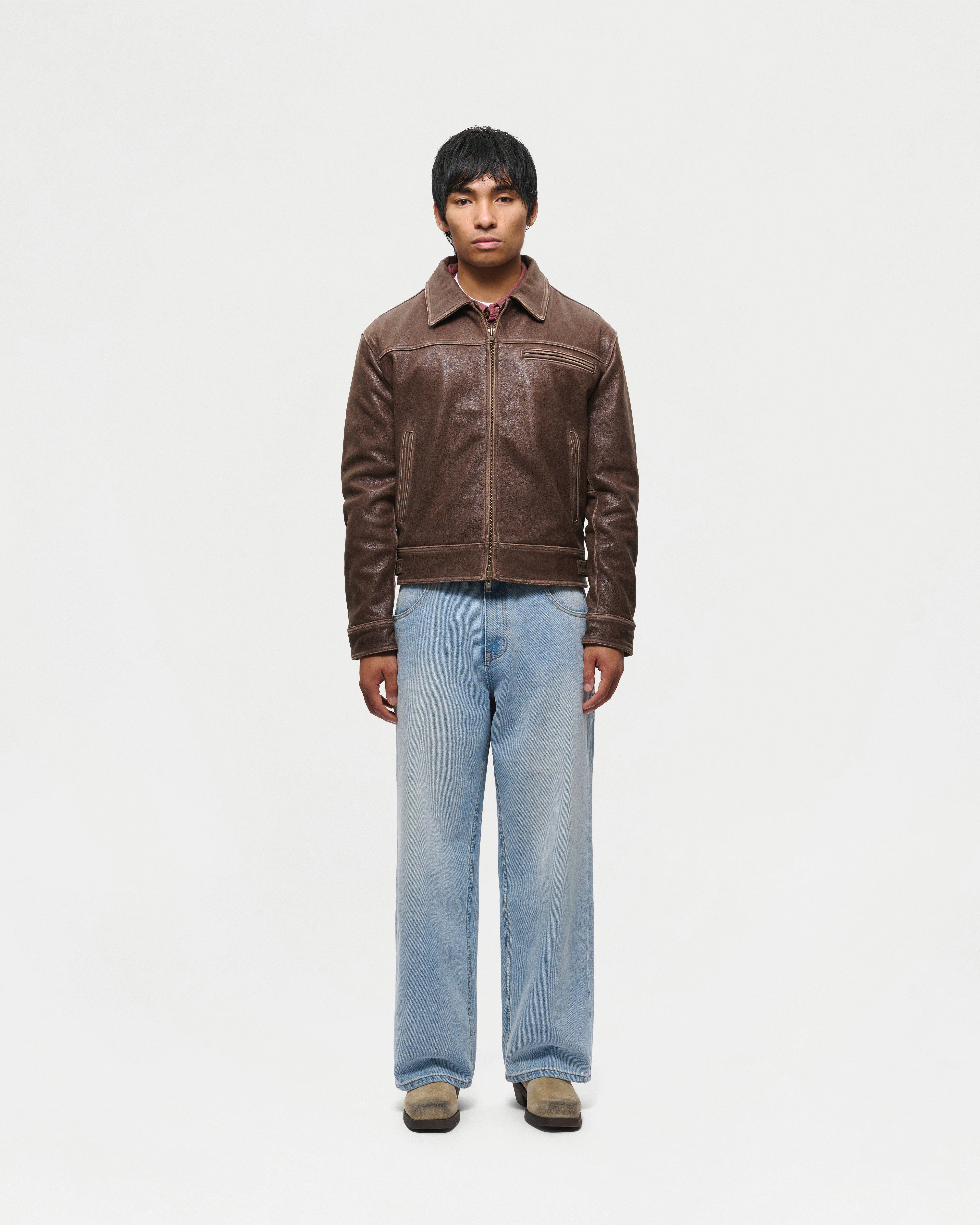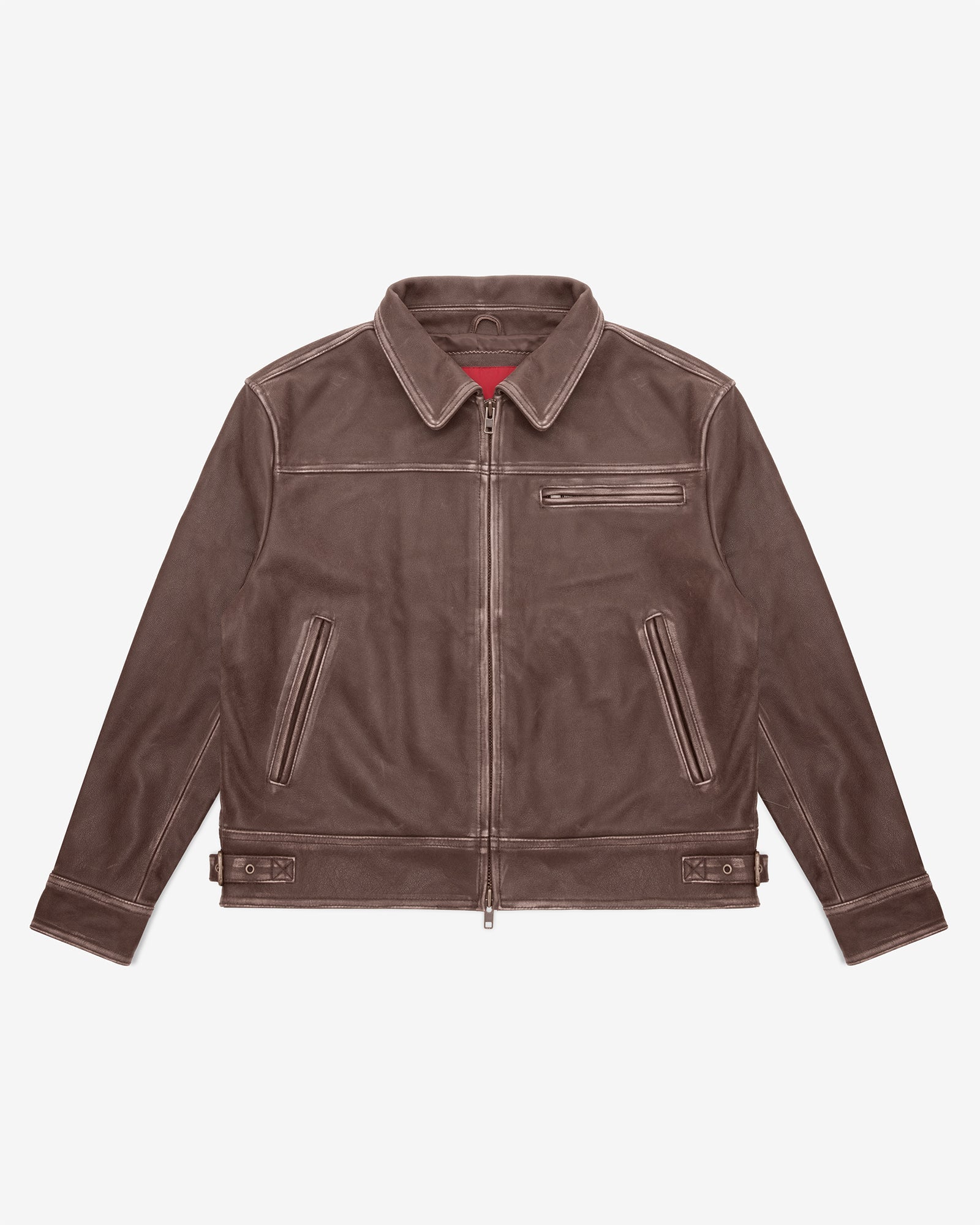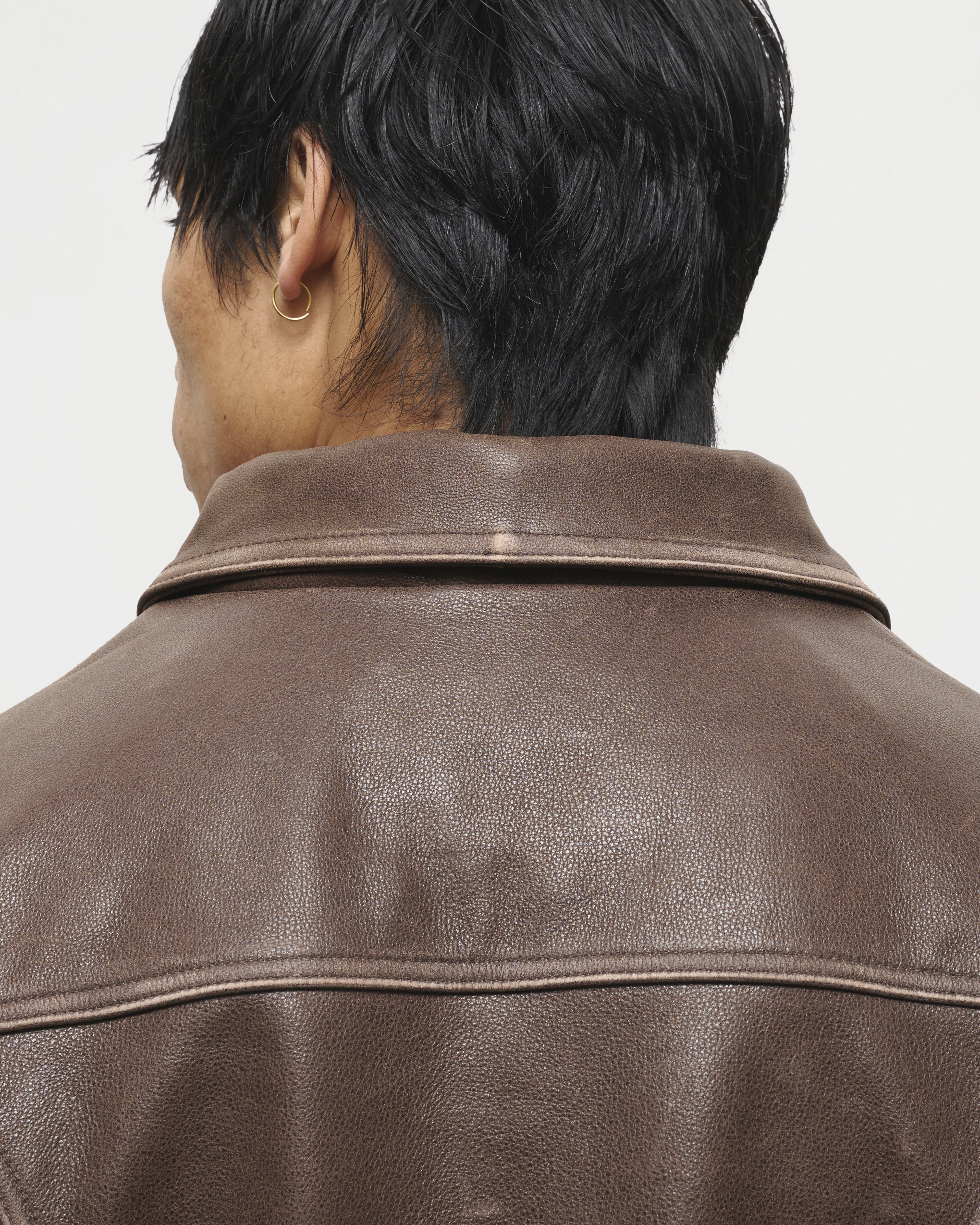 Inspired by vintage leather jackets, the Aged Heavy Wash Leather Jacket is designed for a slightly wide and boxy fit and crafted from premium full-grain cow leather with an enzyme wash for an aged look.